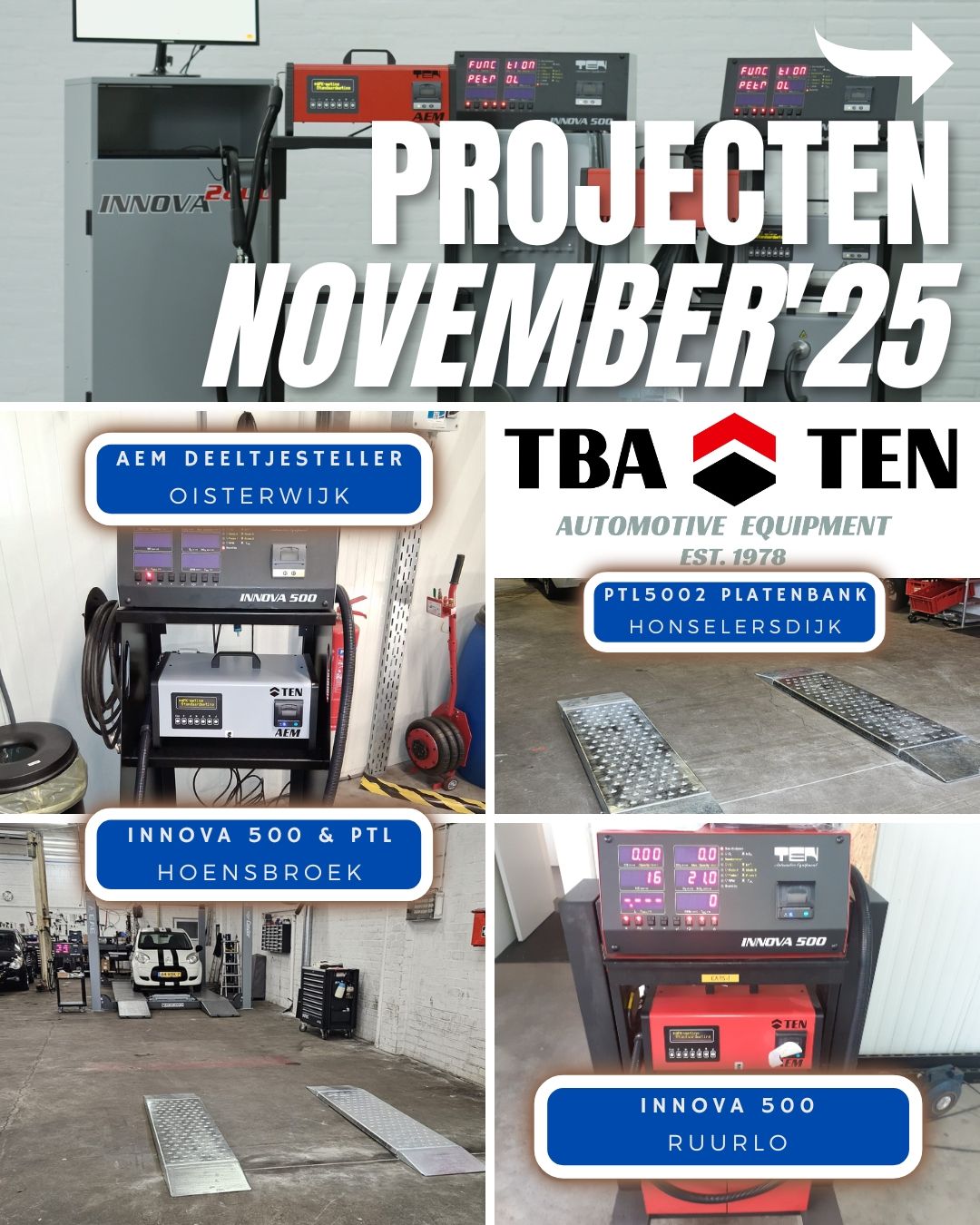 Projecten november '25 Ook afgelopen maand konden we weer de nodige installaties verzorgen. In de afbeeldingen een greep uit onze uitgevoerde projecten! Waarom kiezen voor TBA-TEN ? - Bewezen kwaliteit: van productie, tot montage en aftersales alles in eigen beheer. - Snelle levertijden: plaatsing binnen enkele dagen mogelijk (ook bij APK set). - Persoonlijke service en landelijke dekking. - Koop rechtstreeks bij de fabrikant! Heeft u ook interesse in TEN APK meetmiddelen zoals 4-gastesters, roetmeters, deeltjestellers, remmentestbanken en/of een complete APK set? Neem dan contact met ons op of benader uw automaterialen leverancier. Liever onze producten live zien voordat u een keuze maakt? Kom dan op 27, 28 of 29 Januari 2026 onze stand E06 bezoeken op Vakbeurs Auto Prof te Gorinchem. www.tba-ten.nl | info@tba-ten.nl | 0294-284428