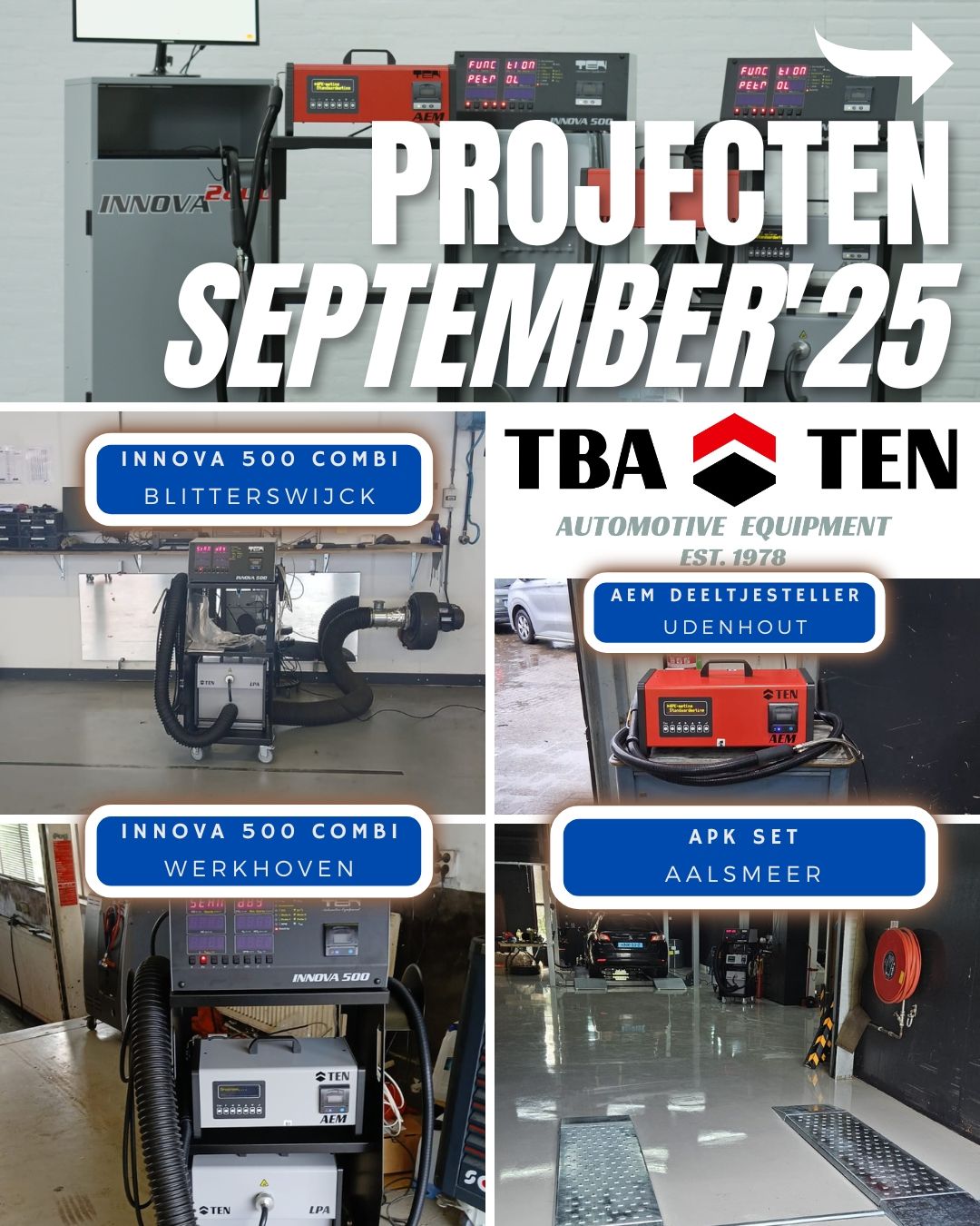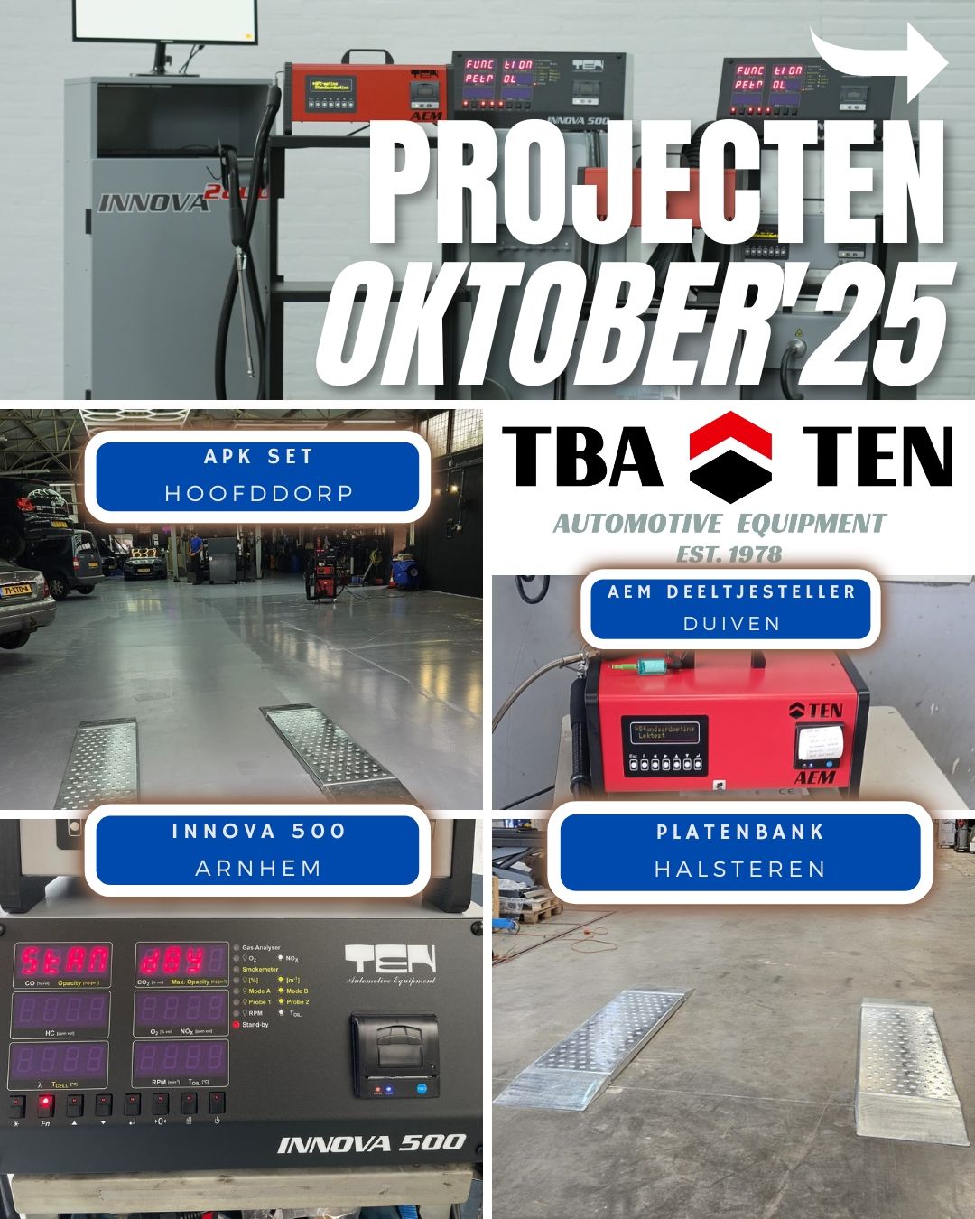 Projecten oktober '25 De laatste dag van de maand is aangebroken, oktober was een drukke maand met weer de nodige installaties. Van nieuwe klanten tot bestaande relaties die nieuwe meetmiddelen benodigd hadden: snel schakelen is daarin onze kracht! In de afbeeldingen een greep uit onze uitgevoerde projecten! Waarom kiezen voor TBA-TEN ? - Bewezen kwaliteit: van productie, tot montage en aftersales alles in eigen beheer - Snelle levertijden: plaatsing binnen enkele dagen mogelijk (ook bij APK set). - Persoonlijke service en landelijke dekking - Koop rechtstreeks bij de fabrikant! Heeft u ook interesse in TEN APK meetmiddelen zoals 4-gastesters, roetmeters, deeltjestellers, remmentestbanken en of een complete APK set? Neem dan contact met ons op of benader uw automaterialen leverancier. www.tba-ten.nl | info@tba-ten.nl | 0294-284428